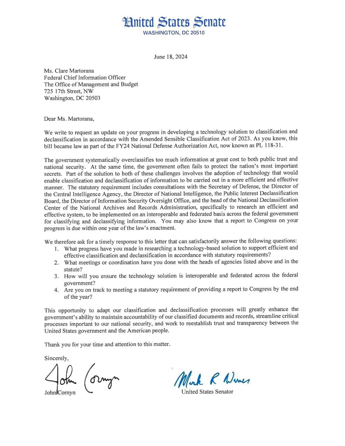 Uma coalizão bipartidária de dez senadores dos Estados Unidos, incluindo o presidente do Comitê de Inteligência do Senado, Mark Warner (D-Virginia), enviou uma carta à Chefe de Informação Federal, Clare Martorana. O documento solicita um relatório sobre a implementação das reformas de classificação aprovadas em dezembro de 2023.